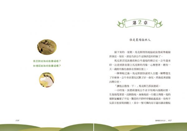 「這事很可能發生在我們身上!」馬克斯打斷女兒的辯駁,不能再逃避這個問題了。「我們需要一位新的領導者,一位具有創造力、有勇氣、有能力帶領農場開創新局的領導者。」他直視女兒的眼睛說道:「妳自小的時候,就展現出與眾不同的心思,妳總是能看穿表象,找出獨特的解決之道。」