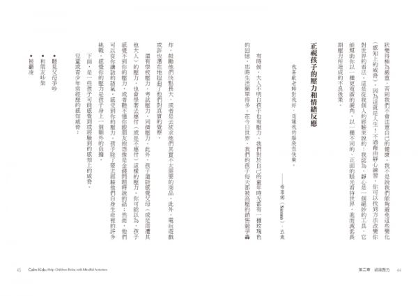 正念靜心能夠幫助孩子在日後的生活裡,清楚覺察到自己的緊張和壓力,並且學著處理它們。在這本實用又具有啟發性的書裡頭,蘿倫.莫瑞提供了許多不同的練習途徑,包括: