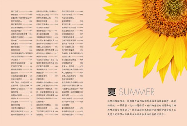 這本書依時節嬗遞與流轉,分成春、夏、秋、冬四個季節,以一年為期,每個季節中的每一天都附上簡單可行的步驟與建議。每個季節含括以下特色: