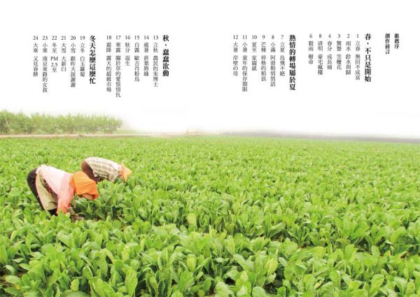 每年農曆年前,農人忙著春耕,等到第一期春耕結束,不得不服老的老農,通常會在第二期選擇休耕,讓田、讓人都喘口氣,也讓夏颱致災程度降到最低。中秋節前後,第三期的冬季裡作開始,也到了一年之中最忙碌的階段。紅豆、黃豆、玉米、長豇豆、四季豆,大瓜、南瓜、冬瓜、地瓜和白玉蘿蔔,茄子、辣椒、小番茄,和即將走入歷史的菸葉,各種作物在農民雙手指揮下,譜出熱鬧活潑的田園樂曲。