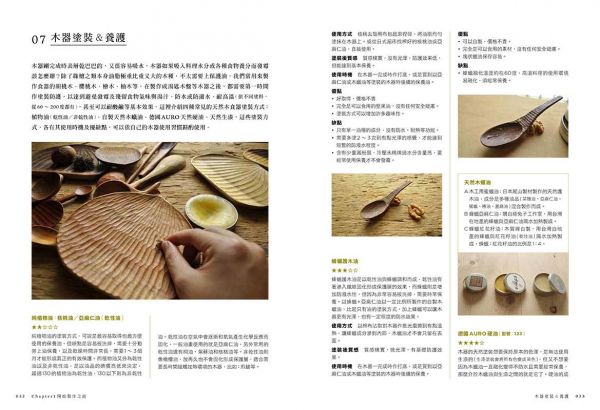從木食器到廚房道具,有最詳盡的圖解,STEP BY STEP一步步帶你完成!還將各式餐桌上的木器具一字排開,完成品各角度細部說明,用職人之眼掌控細節!