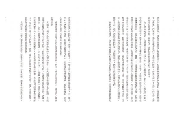 如果相信有一個出生的時間,那麼從邏輯上說,必定有個還未「存在」的時間,以及必定要接受我們有個出生的時間,必定要接受有死亡的時間。有許多問題是關於「尚未存在時」的,比如「人們來到世上的原因是什麼」,「為什麼現在存在」,「為什麼過去不存在」。這些問題無法回答,因為我們一直都處於「存在」的狀態中。我們的存在並不是一個新的創造。