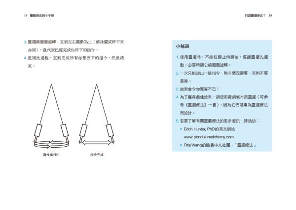 你能用的靈擺指令是無遠弗屆的。你可以隨意使用本書中的指令,也可以自己創造。兩種方法都會成功。我希望你善加利用這本書,它不但是靈擺指令的來源,也是你創造靈擺指令的靈感來源。