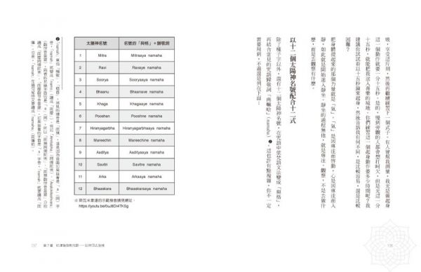 本書中,他以「拜日式」為例,拆解每一個式子如何觀想、如何調息、如何配合持咒..... 每個姿勢都是一種象徵,各有其代表意義:你雙手合十當胸,手指微彎輕合,象徵一朵含苞待放的花,心想「世界上每朵花所蘊藏的花香都含攝在我心中,隨著我的祈禱、禮拜,隨著我為神聖對象奉獻一己而釋放出來」。你抬頭面向太陽,張開手臂,感受那生命力的降臨。你雙手下垂,手指接觸地面,大地的光明、能量上升到你的內在。你雙手觸地,頭低垂到兩膝,你見到一切生靈,與他們同心、分享一切………。如果你的心無法體會到每個體位所要表達的心意,無法和這首聖詩的態度同調,那就不算是哈達瑜伽。