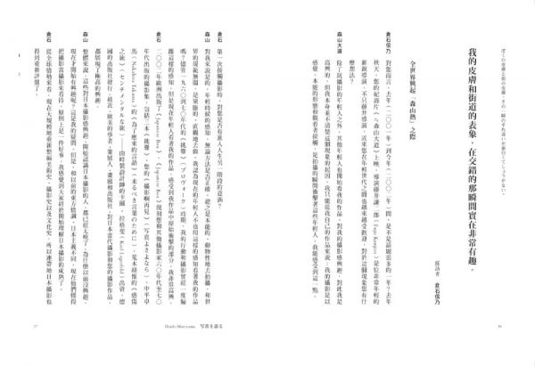 ●第二部「談攝影」──透過與吉田修一、中平卓馬、田中長德、Homma Takashi……到荒木經惟,對談者每位都是日本藝文界赫赫有名的大人物,從文學詩集到數位相機,多方位地對照彼此間異中有同、同中有異的相對思維。