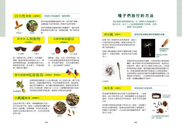 為了把種子散佈得更廣、更遠,在新的地方培育新的世代,植物們也是拼了!親代植物為了要能利用風、水、鳥兒、昆蟲、動物來運送種子,紛紛努力配合外在環境與條件,下足工夫改變果實與種子的形狀、構造和性質,讓種子更容易出門去旅行,去新的地方延續生命。