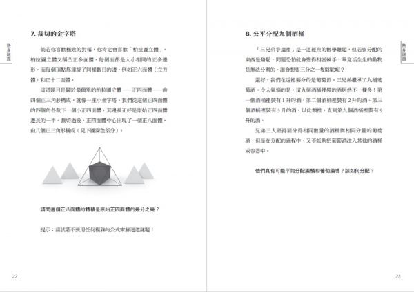 無論如何,現在輪到你上場了!在這本書中,你將遇見關於邏輯、幾何和組合數學的一百道謎題。萬一你被某道難題卡住,請不要太快就放棄了。不妨暫時把它擱到一邊,先去解決另一道謎題。也許到了隔天,靈光一現,你就會想出絕妙的解題方法。