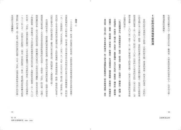 在戰火中倖免於難的京都,保留了二戰前營業迄今的老字號喫茶店,也不乏最新潮的店家,讓人得以飽覽喫茶店一路以來的發展流變,脈絡完整的程度,即使放眼日本全國各地,也屬罕見。從創立於昭和初期,現役喫茶店中歷史最悠久的老店;到引領業界之先,首創自家烘焙咖啡豆的洋派喫茶店;還有店家仿傚歐洲咖啡店,成了人文薈萃的沙龍空間……一種嶄新的都會生活樂趣,透過咖啡,從這些場域傳播了出去。