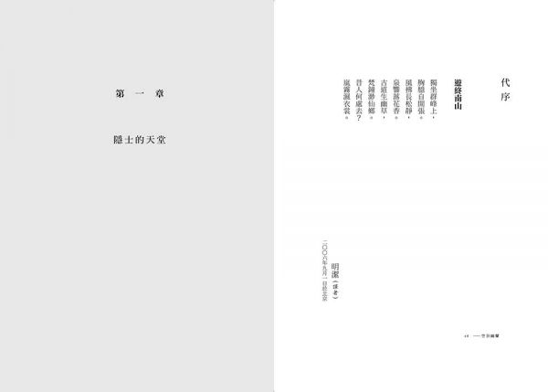 他發現,即使在二十世紀,即使在歷經許多戰亂與變遷之後,終南山上仍居住著許多隱士。這些隱士過著最原始的生活,忍受著常人難以忍受的孤獨和貧寒,他們可能住在茅篷裡,種一點菜,其餘的時間就用來修行。他們喜歡獨處,在獨處中,達到精神的覺醒。他們追求自我的解脫,但同時又不離開這個世間,他們對萬物更深的覺悟和仁慈,讓和諧不是遙不可及的夢想。他們往往是最幸福,又最和善的人。