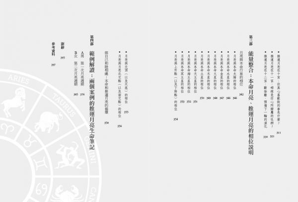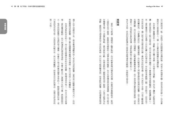 通俗占星學喜歡用描述性的字眼,像是形容牡羊座「大膽」、「果決」和「霸道」,或是形容處女座「井然有序」、「務實」和「挑剔」。如果你認識一團亂的處女座或客氣有禮的牡羊座,請舉手! 善用占星學的最佳方式並不是分門別類,而是提出指引和應對之道。我們如果不要以「自己目前狀態」為出發點,而是用「正要變成的模樣」看待自己的星盤,就能開啟對星盤的全面理解。星盤就像我們的處方籤,建議我們如何活出更充實的人生。你的本命星盤是你最重要的工具,當你知道如何正確利用它時,它就能在你身上發揮更好的效果。這本書會教導你如何使用這個工具中的一個重要元素:月亮。我不只會列出每個月亮星座的性格特質,還會提供你一個範疇,告訴你會在哪個範圍的經驗和課題中遊走,體驗生命,而這都取決於你的選擇。因此,你可以把你的星盤想像成一張地圖,當你在吸收個人經驗時,當你在琢磨理解人生的方向時,月亮就像指南針,指引你航渡大海,時而風平浪靜,時而波濤洶湧,穿越不同的國度,無論熟悉或陌生都能跨步向前。