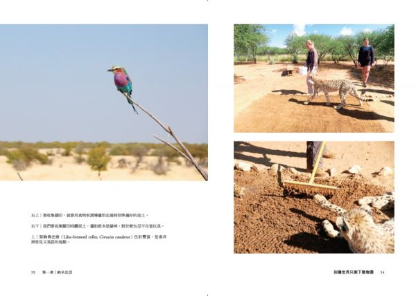 居住在簡樸的宿舍,自己打水、靠著太陽能板提供電力。根據排班內容,有時要餵食大貓,處理完巨大的肉塊,扛上卡車,依序拜訪獵豹、花豹、獅子。有時則要陪年輕的狒狒散步,或者徹夜照顧尚未斷奶的狒狒寶寶。也時常要外出在野生動物保護區內巡視,根據地上的動物足跡跟糞便,還有檢視四處架設的偵查相機,藉此調解當地農民跟野生動物的種種衝突。被野生大象踩爛的柵欄要及時修補;跟著研究人員採集獵豹的腳印;在灌木叢中揪出盜獵者設下的鐵絲陷阱;到當地村落宣導環保跟動保的知識……比起與動物的直接接觸,更多時候是在做科學的調查,做教育,做溝通,為了動物、為了地球,多做一點都還嫌太少。
