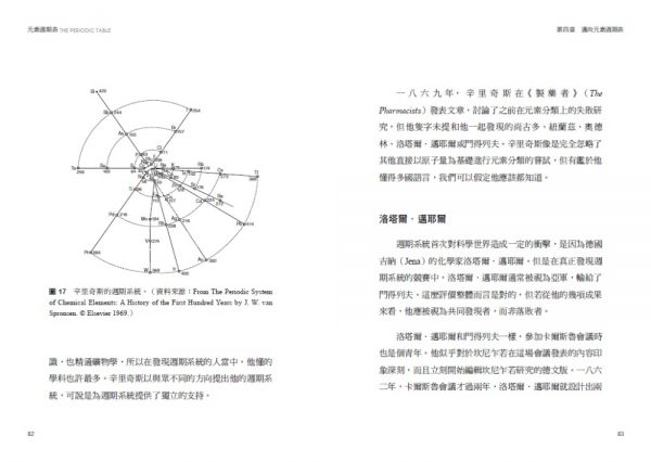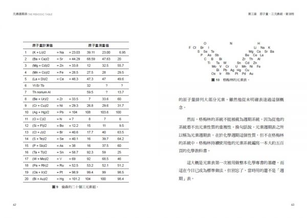 並收錄了包括1871年門得列夫發表的第一版等多種具代表性的週期表版本,