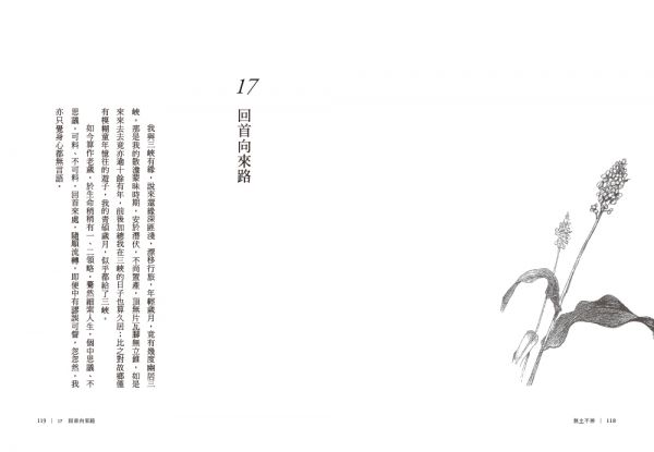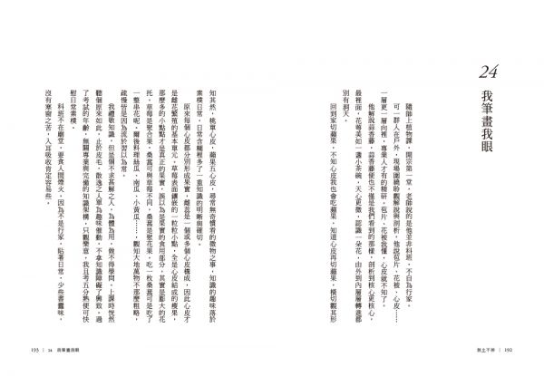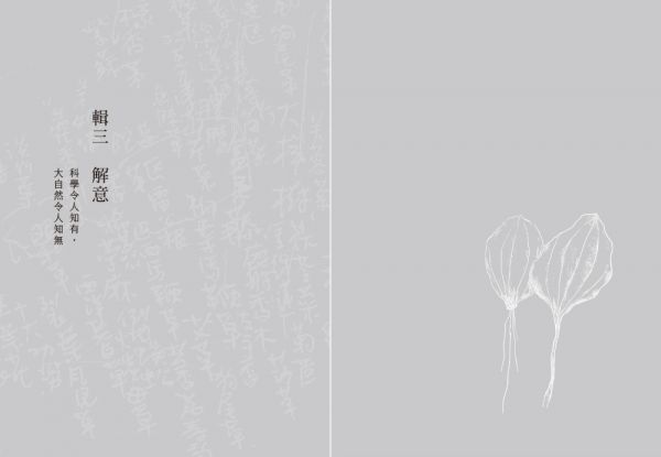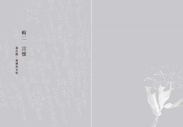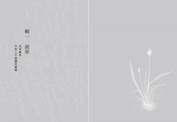 在「說草」一輯,「草民」凌拂讀草如讀字:沒有任何一種草叫做雜草。每一種草都有名字。於市井中蹲踞觀草,密密相叠叢集的綠裡,葉下珠馬蹄金黃鵪菜牛筋草孟仁草王瓜龍葵黃花酢醬草⋯⋯碧波相連,無一不有姓氏。風飛扶搖的細草,像是大地一頁頁翻飛的歌謠。