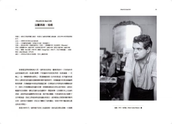 ◎培根──他不僅是創造型天才,有些時候還是竊賊、同志男妓、賭棍、酒鬼、和撒謊大王。他因為組織非法聚賭而多次觸犯法律。他戲謔成性、冷嘲熱諷、虛榮自負、口出惡言、不忠實、也不可靠。他用去汙粉給牙齒拋光,拿棕色鞋油染髮,目光炯炯、嘴唇下垂,即使有了錢,還是住在擁擠骯髒的地方。他說:「我死的時候,把我裝進塑膠袋,扔到水溝裡。」