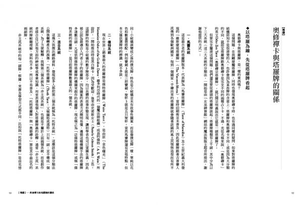 「奧修禪宗塔羅牌」是以塔羅牌的結構,來詮釋表達奧修的主要思想。因此本書開宗明義,特別繪製了奧修禪卡與塔羅牌的結構對照圖解,讓讀者清楚整副牌的邏輯結構,並與塔羅牌互相參照,對於初學者甚有幫助。而且,只要跟著書中的解析,弄清楚象徵符號背後指向的意義,就可以很清楚的看到奧修禪卡與塔羅牌之間的同質性,並進一步看見奧修禪卡擁有一般塔羅牌所沒有的特質──穿越心靈跟現實,一路看進底層。