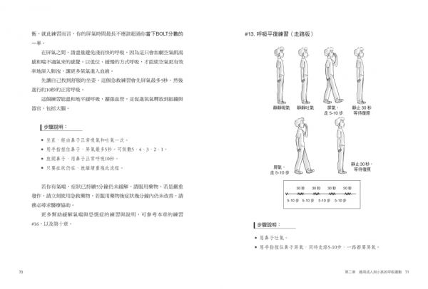 你可以在這本書裡找到你所需要的一切,來理解呼吸是如何影響你的健康。書中內含二十六種呼吸練習,全都有不同用途:從重新訓練呼吸,阻止恐慌症發作,為提案或競賽做好準備,改善睡眠品質,讓身體暴露在好的壓力下,到對抗壞的壓力,應有盡有。別擔心,你不需要全部都學會。只要挑出一或兩種呼吸練習,好好練習,然後再回頭去學會更多呼吸練習就行了。你將會學到如何幫自己進行身體氧氣含量測試(Body Oxygen Level Test,以下簡稱BOLT),評估自身的呼吸健康狀態,才能挑選出最適合自己的計畫。